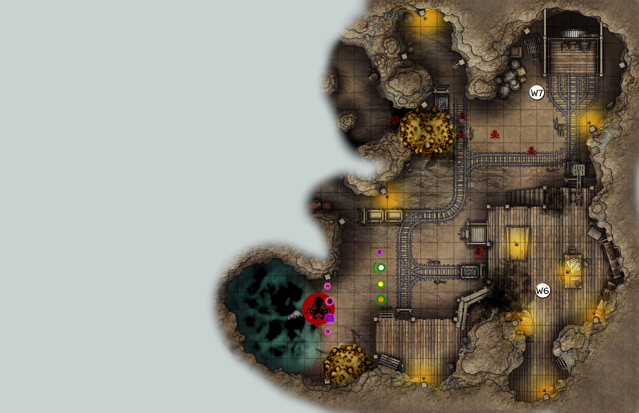 [Make your moves, spots adjacent to the octopus are available for melee actions, remember, Cat needs to re-enrage, Guidance has expired, Bless is still in effect. As with Ashley, you may spend a turn preparing for this attack, those turns may not include bestowing more than one set of temporary HP and only one spell may be cast, only the second turn can include attacks]